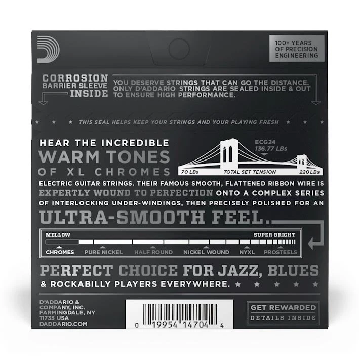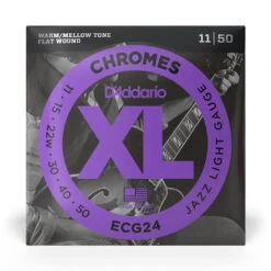 ECG24 is D’Addario’s best-selling flat wound guitar string set. XL Chromes are noted for their smooth feel and warm, mellow tone, essential to the sound and style of many jazz, blues, and rock players.