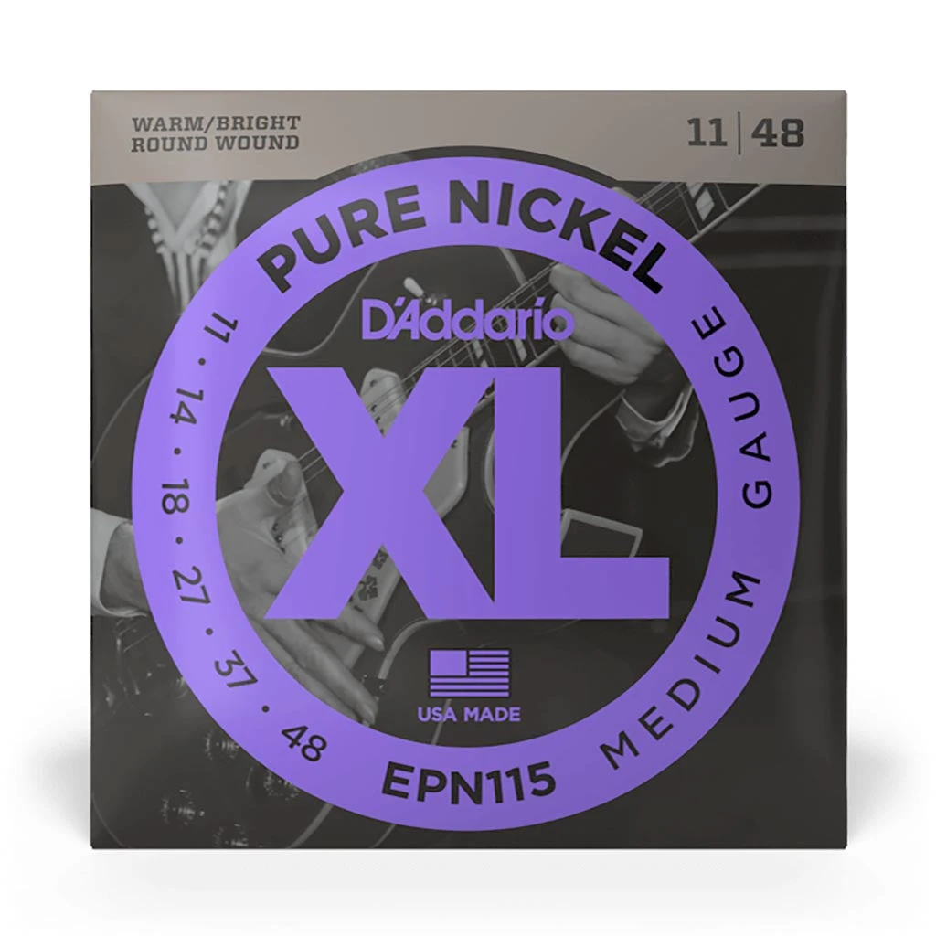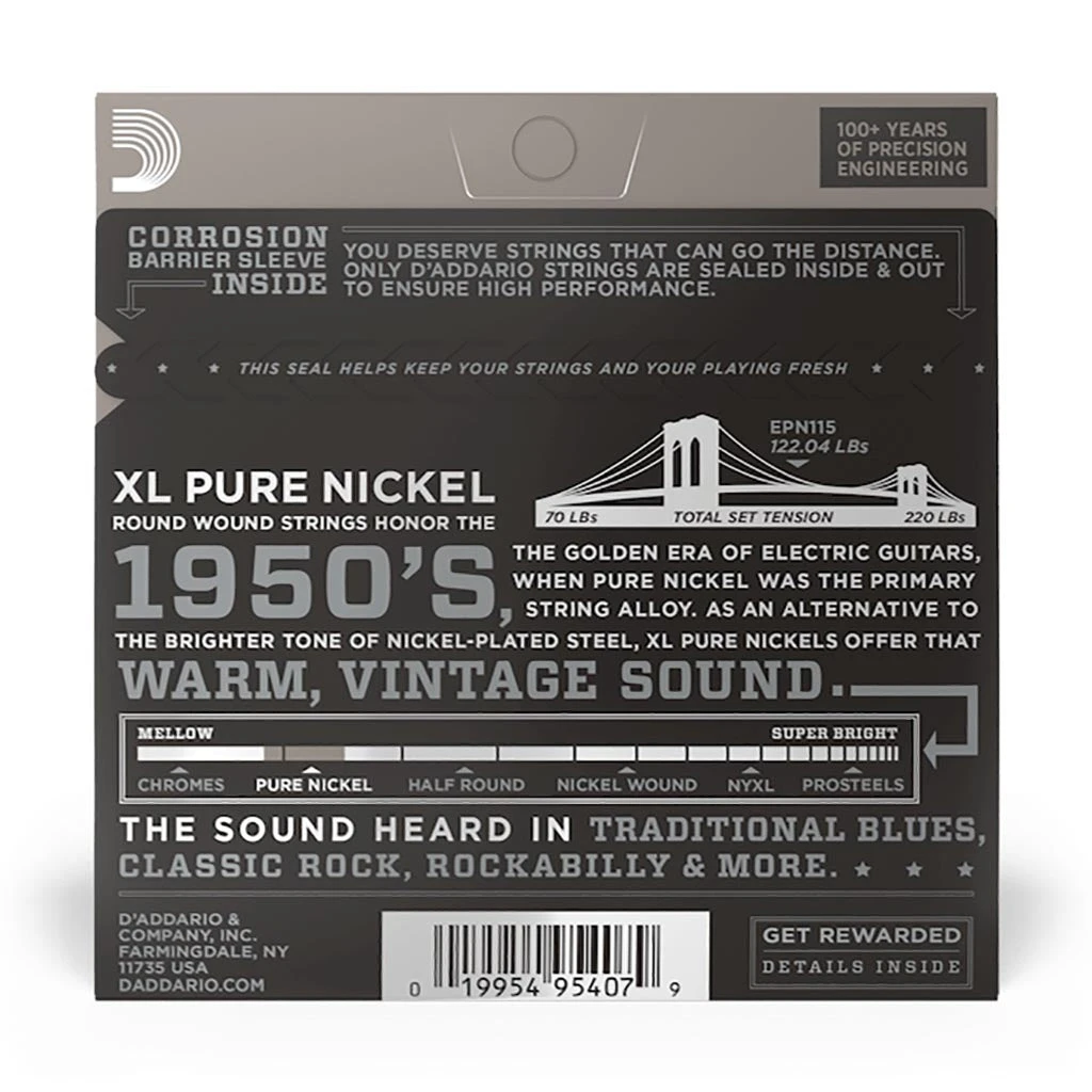 EPN115 is a medium light gauge string set for electric guitar that delivers a warm, vintage Pure Nickel strings produce the vintage guitar sound of the 1950’s, an era when pure nickel wire was used to wind guitar strings. These strings produce the rich, warm tones heard in traditional blues, rock & roll, and country.