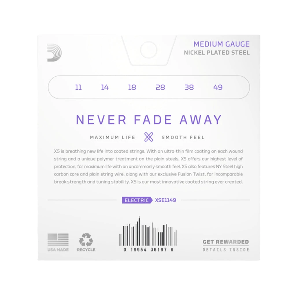 XS Nickel coated electric guitar strings provide the longest life of any D’Addario electric guitar string. Coated with our groundbreaking XS coating, these premium electric strings attain maximum life and a smooth, fast feel without dampening their outstanding tone. Constructed with a NY Steel core, reformulated nickel-plated steel wrap wire, and Fusion Twist technology, XS Nickel strings boast superior strength and tuning stability, plus richer harmonics, greater clarity, and remarkable definition with every sweep, slide, and bend. This 11-49 Medium gauge set provides increased volume, with slightly more tension and resistance.