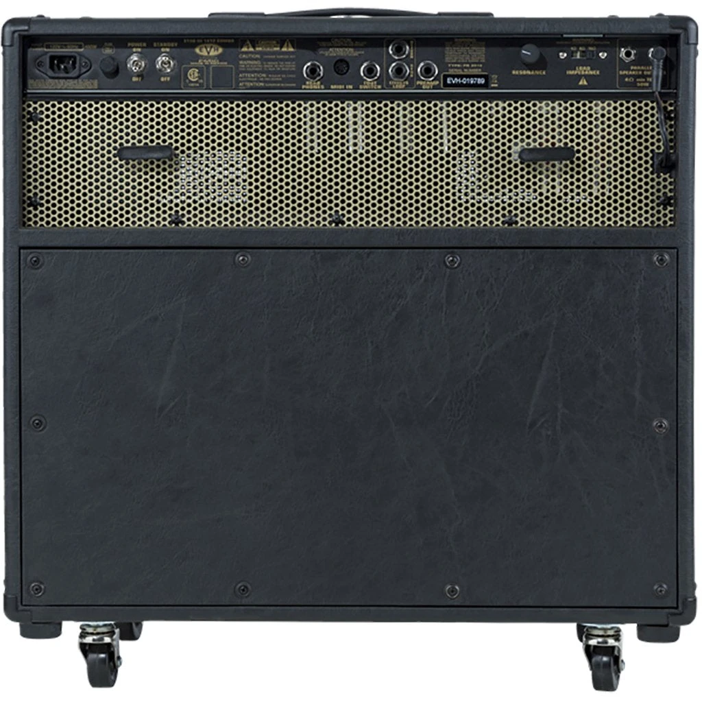 The black cabinet is constructed out of birch with special internal baffling for tight and increased bass response. Sporting a slick black and gold striped motif on the control panel, this combo is finished off with black vintage-style chicken knobs, red LED jewel indicator, molded black plastic top handle and pop-out casters. A high-quality fitted cover is available as an EVH accessory.