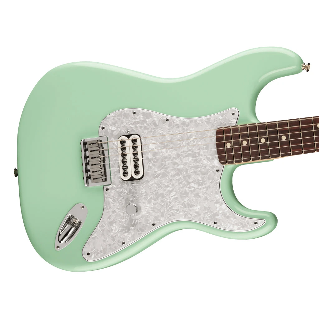 The Tom DeLonge Stratocaster boasts a Seymour Duncan® Invader™ humbucker for immense output and turbo-charged tone that’s perfect for chunky power chords and crunchy riffs. But it’s not all about power—the streamlined control setup consisting of a single master volume combined with a treble bleed circuit preserves the guitar’s natural high-end, ensuring sparkly cleans and chime-y edge-of-breakup tones. The comfy modern “C” neck features medium jumbo frets on a 9.5″ radius rosewood fingerboard for a modern feel with superior playability. Other highlights include vintage-style tuners and hardtail Stratocaster bridge with block saddles for classic looks, superior intonation and enhanced tuning stability. A custom crafted Tom Delonge neck plate is decorated with Delonge’s original artwork.