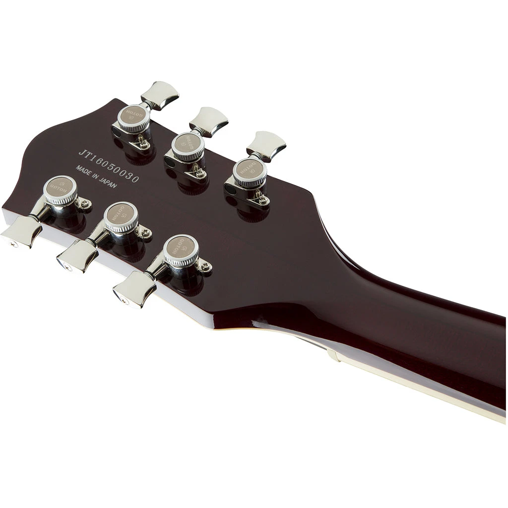 For big sound in a small package, the G6659TFM Players Edition Broadkaster® Jr. Center Block Single-Cut with String-Thru Bigsby® and Flame Maple features a slightly smaller single-cutaway body for greater comfort, tonal focus and feedback resistance, all in stunning tiger flame maple with a matching headstock. Two new U.S.-made Full’Tron™ pickups deliver full-spectrum sonic range with a growl unlike any other pickup, in addition to classic Gretsch chime, balance and brilliance with a dash of extra-mid concentration for powering through overdriven and distorted passages at full volume.