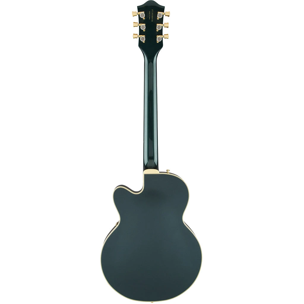 The G6659TG is available in a pair of classic Gretsch finishes — Cadillac Green or Vintage White, and decked out with a matching headstock, tortoise pickguard and gleaming gold hardware.