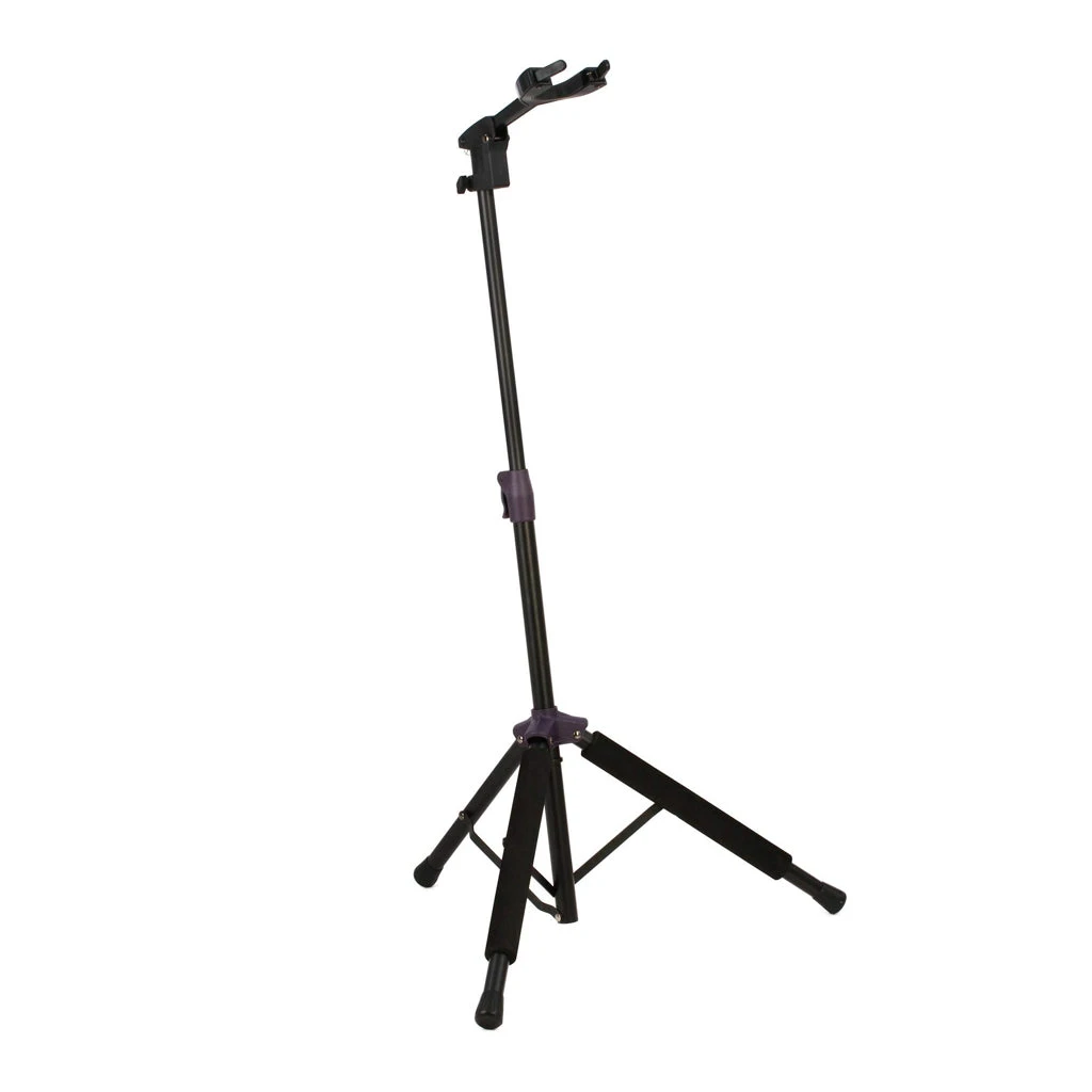 The GS8200 Hang-It ProGrip II Guitar Stand delivers enhanced guitar security alongside convenient one-handed operation. As a guitar is placed in the yoke, the yoke closes itself around the neck to prevent the guitar from being bumped off the stand and the yoke automatically opens when the guitar is lifted. Padding on the yoke and leg bumpers prevents scratches and the specially formulated inert padding is safe for use with most vintage finishes. The height-adjustable guitar hanger and stabilizing bumpers accommodate any traditionally shaped guitar including acoustic, electric, and bass. The braced tripod base provides stability and balance for dependable instrument support. For efficient transportation and storage, the base and yoke fold down.